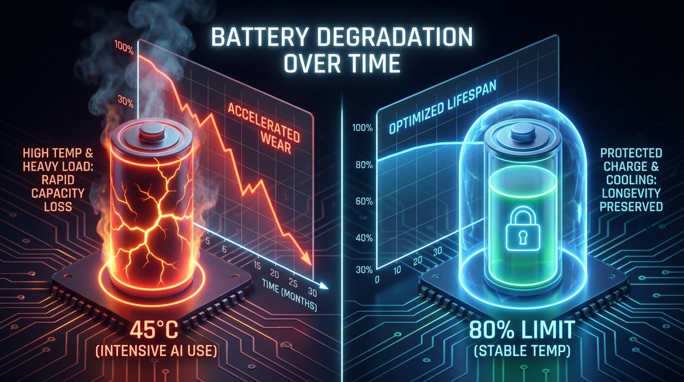 Um conceito técnico vital que muitos ignoram é a relação entre Voltagem e Temperatura. Uma bateria carregada a 100% está sob máxima pressão química. Se, nesse estado, você exige que a NPU trabalhe intensamente em tarefas de IA, o calor gerado age como um catalisador, destruindo a estrutura interna do componente.
