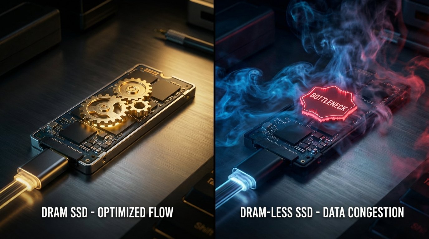 Imagine uma biblioteca gigantesca sem um catálogo na recepção. Para achar um livro, você teria que percorrer corredor por corredor. É assim que um SSD DRAM-less funciona. Ele armazena o mapa de onde os arquivos estão na própria memória NAND (onde ficam os arquivos).