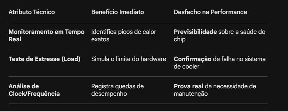 Ao rodar um teste de estresse, observe a coluna "Clocks" e "Temperatures" simultaneamente. Se a temperatura bater na casa dos 90°C a 100°C e você notar que os MHz do processador caíram drasticamente (ex: de 4200MHz para 1800MHz), o veredito é positivo para Throttling. É o sistema protegendo o silício de uma falha catastrófica. Este é o momento em que a manutenção deixa de ser opcional e se torna urgente.