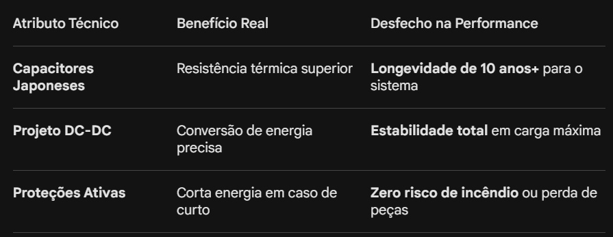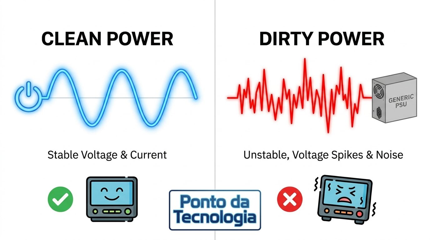 O maior problema das fontes genéricas não é apenas o risco de explosão, mas o que elas fazem no dia a dia. Elas entregam uma energia "suja", cheia de ruído elétrico. Você não percebe, mas os capacitores da sua placa-mãe estão a trabalhar no limite para filtrar essa sujeira. É uma morte lenta: o PC começa a dar erros aleatórios até que, um dia, ele simplesmente não liga mais devido a componentes estufados.