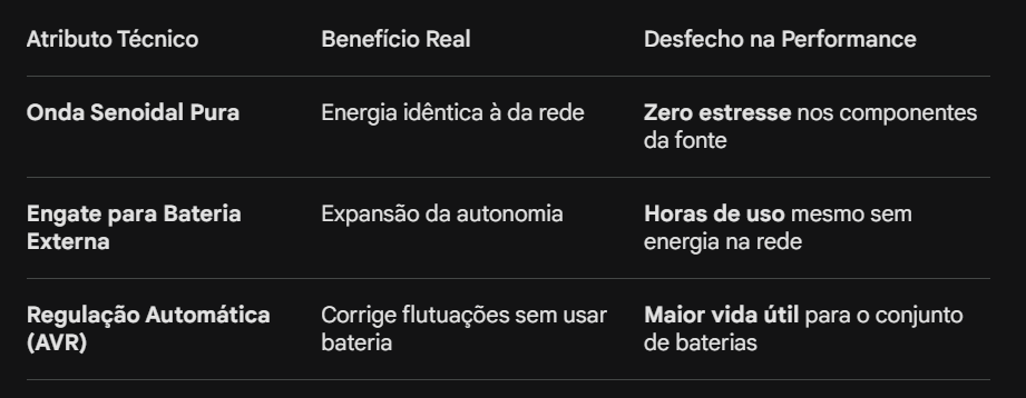 O erro mais comum é comprar o nobreak mais barato da prateleira. Esses modelos "offline" ou "line-interactive" comuns entregam uma onda de energia retangular quando entram em modo bateria. Para uma lâmpada, isso não importa; para uma fonte moderna de PC, isso é um veneno. O som de "zumbido" que você ouve é a sua fonte sofrendo para processar uma energia para a qual ela não foi projetada.